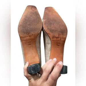 Etienne Aigner square toe pumps, leather textile heels size 8, neutral work shoes, classic block heel pumps, vintage-inspired heels