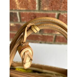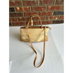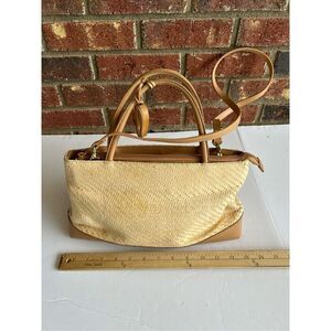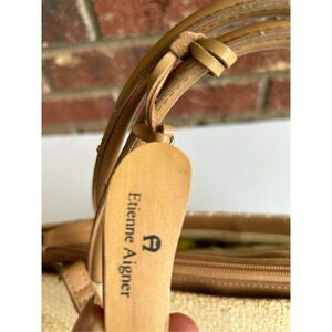 Etienne Aigner woven bag flip flop 13x8" wooded flip flop charm. n6" handles. 19" strap. good used condition.