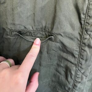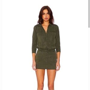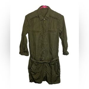 Military style shirt dress! Too buttons free if the bottom, could be tied up for a slightly sexier look. Slight pulling of seam where top and bottoms Connect in the front, no visible when worn. Great basic piece.