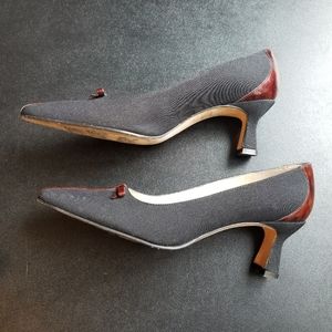 Etienne aigner made in Spain high heels. So pretty, classy, and stylish! Dark grey/black with redish colored accents, back of heel and single stripe down front of shoe with small bow at the top. Bottoms have some type of tape on them, assuming it's for traction and should be able to remove easily if not wanted. Size 7.5 M