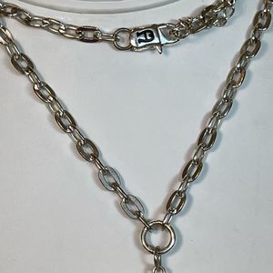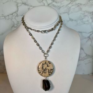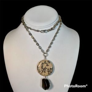Etienne Aigner Large Dalmatian Jasper Stone Drop Necklace Silver Tone Signed