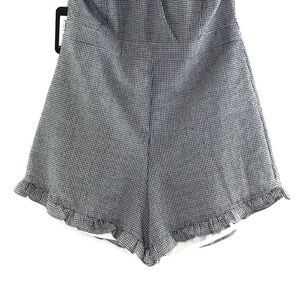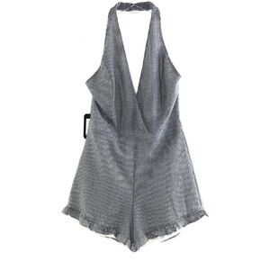 Brand new with tags. White and black open back halter romper. Features a checkered print pattern throughout. Raffle hem. Surplice neckline with an elasticized back neck. Lining in upper front and shorts section. Zipper and hook eye closure in back.