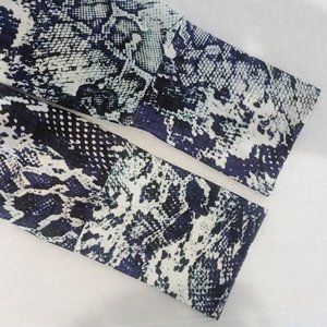 The material is a silky feeling polyester stretch fabric featuring a blue snakeskin design.