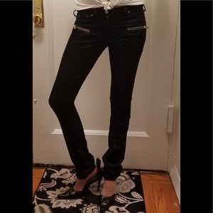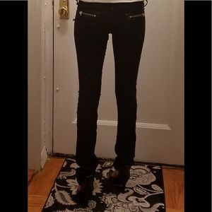 Very light weight shimmery black.corduroy Moto pants label says zero but they fit tight 26 in jeans size straight leg 3 regular as jeans stale pockets in front +2 zip up pockets 2 back zip up pockets good used condition showed some light wear full length from waist down 41 inch 31 1/2 inseam these are low rise so waist across is 15 since they hipsters pants crouch is about 8 or 8 1/2 depends how it’s mesured last pict what it looks like paired with Moto leather jacket