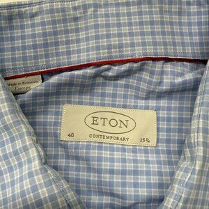 Eton Contemporary men's size 15.75 - 40 blue check long sleeve button up shirt. The shirt has stains in the armpit area. Please see pictures for details. Thanks! I ship fast and package securely for safe delivery!