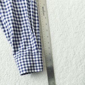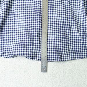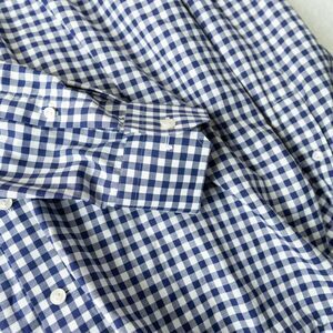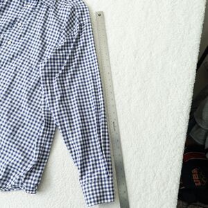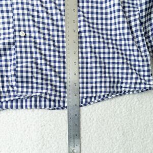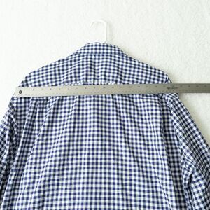 This is a blue and white gingham print shirt. The shirt is a button down with long sleeves. Made from a wrinkle resistant fabric and features a classic fit. In good pre-owned condition with minimal signs of wear. No holes or stains present.