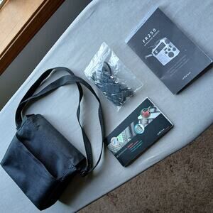 comes in black carry case with adjustable crossbody strap and magnetic snap closure