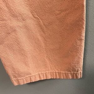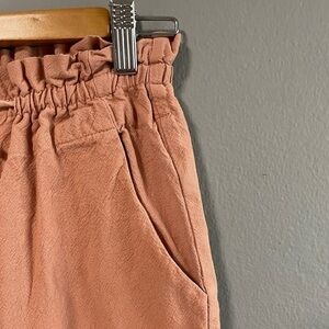 Elastic waist with functional drawstring. Side pockets. Zipper button closure. High waisted. Rise: 11.5”, waist: 24”-30”, inseam: 22”, leg opening: 8.25”. 55% linen, 45% cotton. Peach color.
