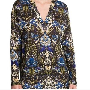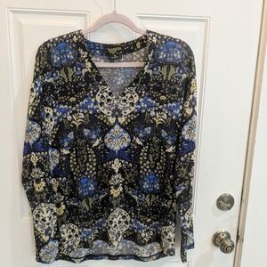 Stylish blouse with a vibrant floral and bird pattern. Features long sleeves and a V-neckline. Perfect for any occasion.