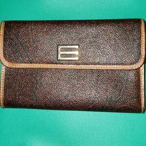 Stylish brown textured wallet featuring a gold accent. Perfect for everyday use. Has some wear it is preloved. Vintage Etro wallet.