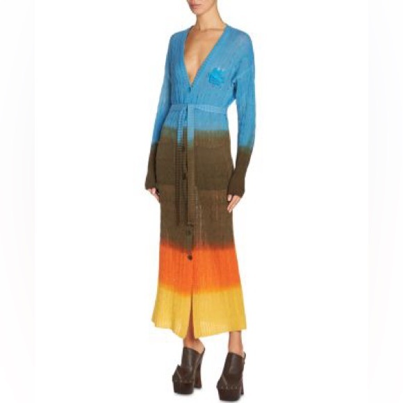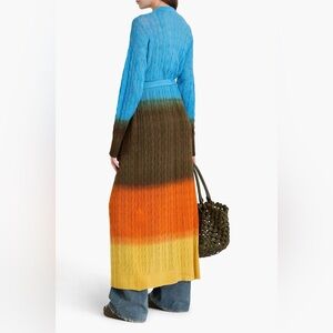 Etro ombre cardigan with a belt. Features blue, brown, and orange.
