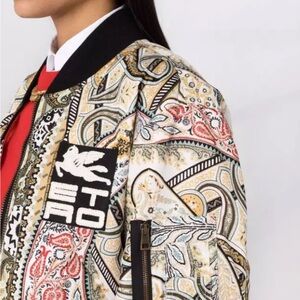 Reversible bomber jacket from Etro. Fastened with a two-way zipper, this style features a two-way zipper and black rib-knit detailing on the collar, bottom hem and cuffs. It reverses between and a white side with a colourful graphic print, a logo patch and two flapped pockets with snaps on the front and multiple sleeve pockets and an orange side with just two snap-fastened pockets on the front.