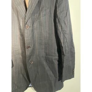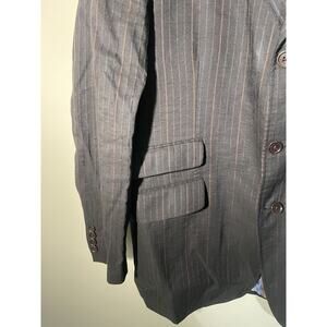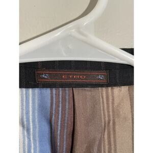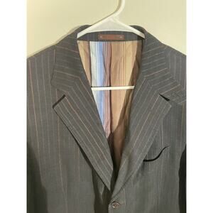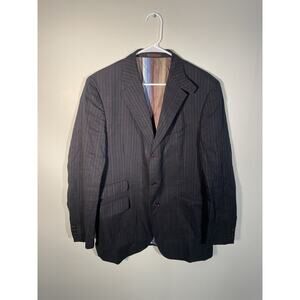 Etro Milano Men Blue Pinstripe Wool Blend Sport Coat Blazer Jacket US 44L EU 54L. Excellent used condition. 1 small spot that is shown in photos, will likely come out with a wash / dry cleaning. See photos for overall condition and measurements.