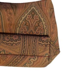 This beautiful shoulder bag features a cotton canvas exterior with Etro's signature tan paisley print, gold-tone hardware, and a top zip closure. It has a single strap and a beige leather interior with a zip pocket. With inspiration from Indian and Persian motifs, this bag blends tradition and modernity. Quality made in Italy, it comes with its original box (minor damage). MSRP $925.
