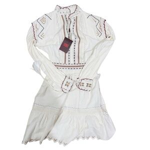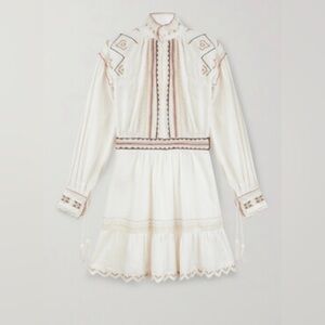 Design details: embroidered design, dropped-shoulder sleeves, self-tie cuffs, and shirred hem Left side on-seam zipper