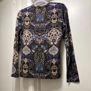 Gorgeous, luxurious piece. This shirt is a lovely wool blend but very soft. Dramatic and colorful print of winged-leopards and other animals. Euro size 44/medium but looks small. Hard to read the care instructions but maybe you will have better luck! Let me know if you need more info! No signs of damage.