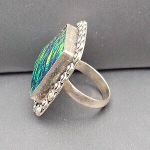 Etruscan Revival Ring Dichroic Glass Cabochon VTG Silver-Plt Size 7.5 Jewelry