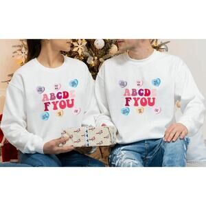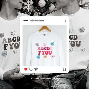 Bold, cheeky, and full of personality. This Etsy graphic sweatshirt features a playful “ABCDE FU” design surrounded by colorful Valentine-style candy hearts. With its soft fabric and slightly oversized fit, it’s the perfect statement piece for cozy, casual days with attitude.