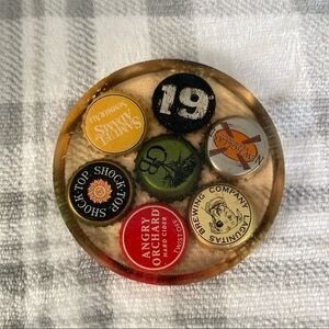 Coasters made with clear epoxy resin and reclaimed bottle caps.