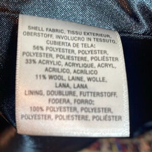 Tan tweed with rainbow multi color threading throughout. Snap button front closure. Front patch pockets. Maroon thread fringe trimming. Lined.
