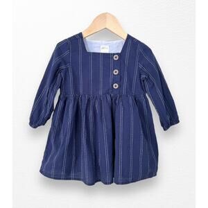 Navy blue with white ticking stripe dress from boutique brand Ettie + H in size 18-24 months. 100% cotton with a crinkly texture that almost feels like linen. Fully lined, features a square neckline and woodgrain buttons on the front.