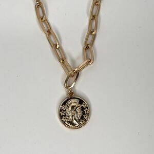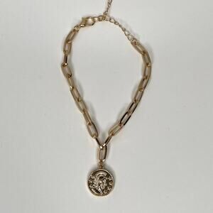 Chunky gold chain with coin charm, pendant. Adjustable, approximately 7-9.5", lobster claw closure. Comes with dust pouch cover.