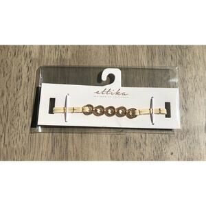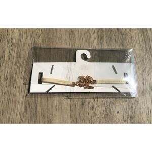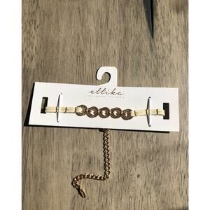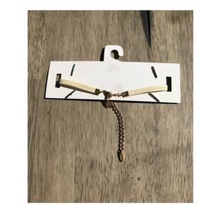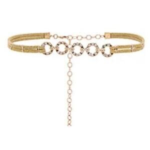 This choker is stylish and gives boho vibes. It is perfect for layering necklaces as it has a minimalist style. It is a suede band in a light tan or off-white shade. It features 18k gold accents and gold circles with rhinestones in the design. It is a lobster clasp closure. It measures approximately 16" in length. New in package.