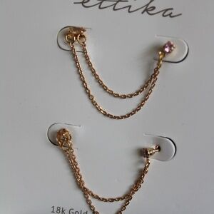 Ettika double piercing chain dangle earrings pink crystal 18k gold plated