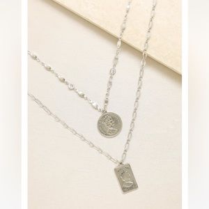 Brand new never worn! I had in my jewelry stand for over a year and never wore it. It’s rhodium and two necklaces with coin like charms of the queen. It’s super cute too!! One necklace is shorter for a layering look. Below is what is listed on the website. This is $55 online brand new.