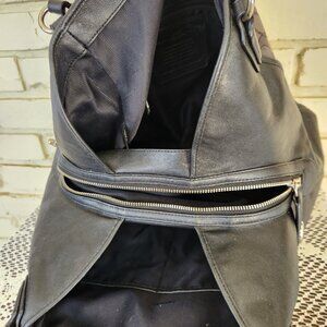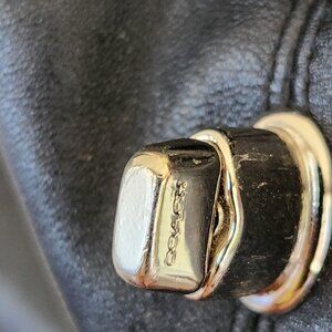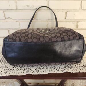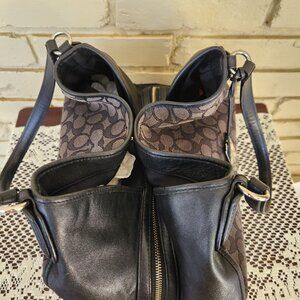 black & gray signature c's, and genuine black leather trim and straps, It is large in size perfect or women-on-the go with silver colored hardware.