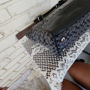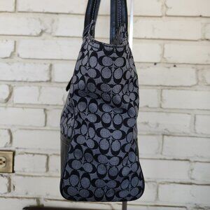 C520 11"x9"x3" The Coach No. D1226-19915 New York Legacy Signature Stripe Candace Carryall Handbag is a stylish and versatile accessory for women. This medium-sized tote bag features a classic rectangular shape with a black exterior, denim fabric, and leather handles. The bag includes a zipper closure, three inside pockets, and one outside pocket, making it perfect for everyday use or various occasions such as travel, parties, casual outings, or workwear. The black hardware accents with fringe and tassel details add a touch of sophistication to this designer piece from Coach's Legacy collection. With a timeless striped pattern and signature logo, this handbag is a must-have for any fashion-forward woman. Generic shoulder strap.