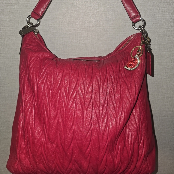 Coach Madison Gathered Twist small Phoebe shoulder bag in raspberry red leather. Style: Hobo shoulder bag with a slouchy, gathered leather design.