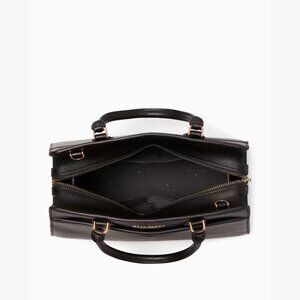 features zipper closure, double black leather straps for carrying and comfort with additional shoulder strap. The interior is lined with classic Kate