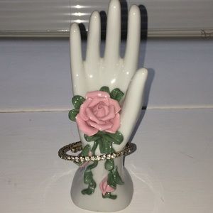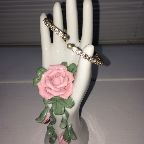 Rhinestone wrap around bracelet. Perfect little piece of costume jewelry because you don’t have to mess around with a clasp and super sparkly. Measures 7.75” resting circumference, although can be stretched to 8.5” to take on & off
