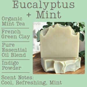 Ingredients: *Mint Tea (Distilled Water, *Peppermint Leaves,*Spearmint,*Tarragon,*Spearmint Oil), *Coconut Oil, RSPO Palm Oil, Olive Oil, Sodium Hydroxide, Rice Bran Oil, Shea Butter, Avocado Oil, Castor Oil, Sal Butter, Essential Oil Blend of Eucalyptus, Peppermint and *Spearmint, French Green Clay, Kaolin Clay, Sodium Lactate, Indigo Powder *Organic