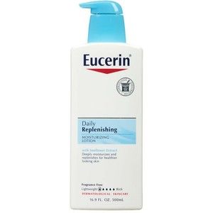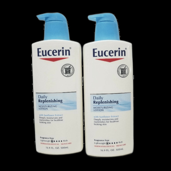 Eucerin daily replenishing moisturizing lotion. Replenish your skin everyday with eucerin daily replenishing body lotion. This body lotion with sunflower extracts pampers your skin by deeply moisturizing it and protecting it from irritation and dryness. Deeply moisturizes and enhances skin health. Light and non-greasy, absorbs quickly. Dermatologist recommended. Dry skin therapy.