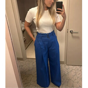Eudon Choi Wide Leg Linen Trousers Blue High Rise Pants Pleated Belted Sz 10