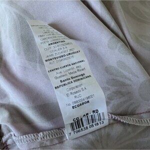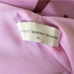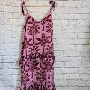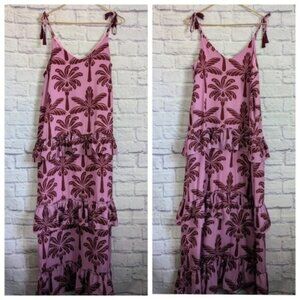 Eugenia Fernandez x Arkitect Tiered Midi Dress. Size Medium. Pink with burgundy red palm floral print. Tiered style skirt with ruffle accents. V neckline. Spaghetti straps with tassel ends. Pullover styling. Unlined.