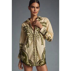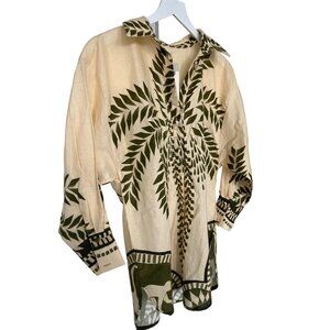 This blouse's unique design, featuring a leafy motif with playful monkeys, captures the essence of both sophistication and whimsy. Made from a high-quality linen and cotton blend, it offers comfort and durability. Its versatile style effortlessly transitions from casual daywear to a chic evening look, making it a valuable addition to any wardrobe.