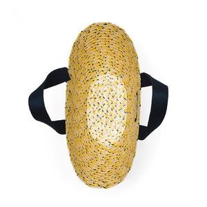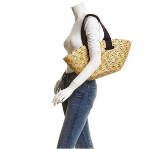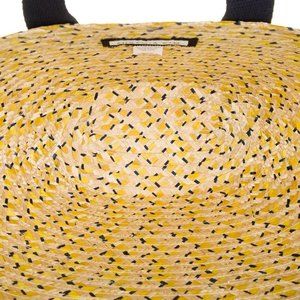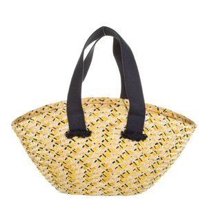 This straw bag with characteristic basket shape features a distinctive multicolored motif.