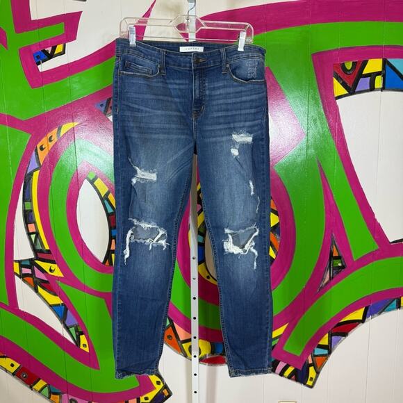 Eunina Blue Straight Leg Jeans with Distressed Rips and Frayed Hems. Size 13