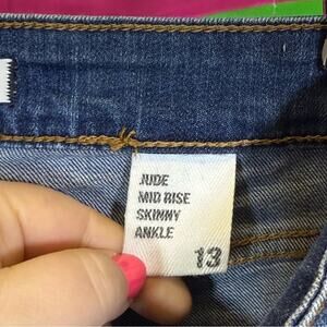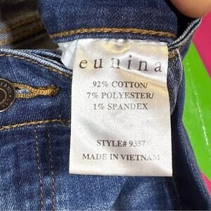 Eunina Blue Straight Leg Jeans with Distressed Rips and Frayed Hems. Size 13. In excellent condition! These Eunina blue straight leg jeans showcase a medium to dark wash with eye-catching distressed details, including rips and tears for a relaxed vibe. The frayed hems add to their vintage charm, making them a versatile choice for casual wear.