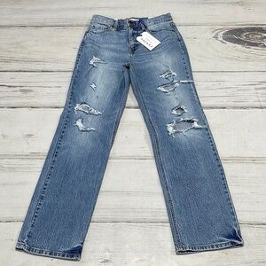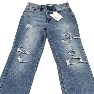 Eunina NWT Codi Super High Rise Dad Jean Pulp Fiction Distress Denim Blue Size 7