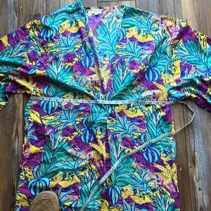 A lush and lively abstract tropical scene in bright teal, green, magenta and yellow makes a retro statement on our exclusive kimono. Made in India with a long silhouette and side slits, this stand-out layer adds jungle-inspired design to your closet and vacation wardrobes. Makes a great cover up as well