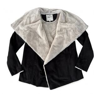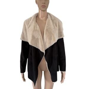 Black and beige sherpa-lined waterfall jacket with soft faux-shearling interior and draped open front. Warm, cozy, and perfect for layering in colder weather. Lightweight feel but very insulated. Suede-feel exterior, plush sherpa inside. Flattering longline cut with natural shaping seams.