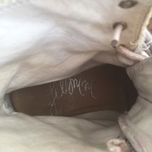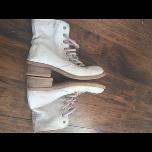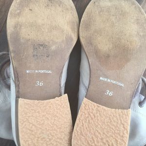 Lightly worn, distressed vintage style, top of the line soft leather, light grey. I took a picture of the inside for brand name, It is hard for me to remember because it is uncommon and hard to read. They have a slight branded butterfly on the outside of each heel, it may be a signature to the brand?