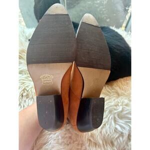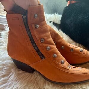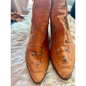 High-quality Euroclub western boots crafted in Brazil with genuine leather uppers. These tan ankle boots feature silver concho studs and cutout details, giving them bold rodeo, cowgirl, and festival-ready vibes. Comfortable block heel with durable soles (see photos). Gently worn with light wear at the toes, but overall in excellent condition with lots of life left.