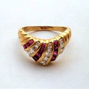 European 18K 750 Yellow Gold Baguette Ruby Diamond Cluster V Design RING P