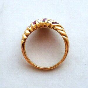 Gorgeous Vintage European solid 18K 750 Yellow Gold Genuine Baguette Ruby and Genuine Baguette Diamond Cluster V Design Ring about size 5.75-6 (marked "750" and acid tested). Top of the ring is about 9mm in its widest, bottom is about 2mm in width. This unique ring weighs about 4 grams and is in great vintage used pre-owned condition. (P)