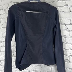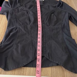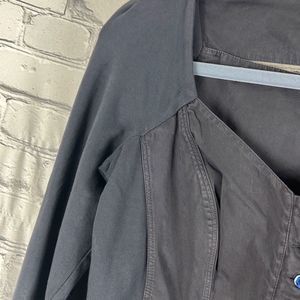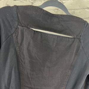 Seller's Note: The color is a dark charcoal gray but with blue undertones. The front fabric is different from the fabric that goes around the back, which has a little stretch to it, plus the cut-out in the back.